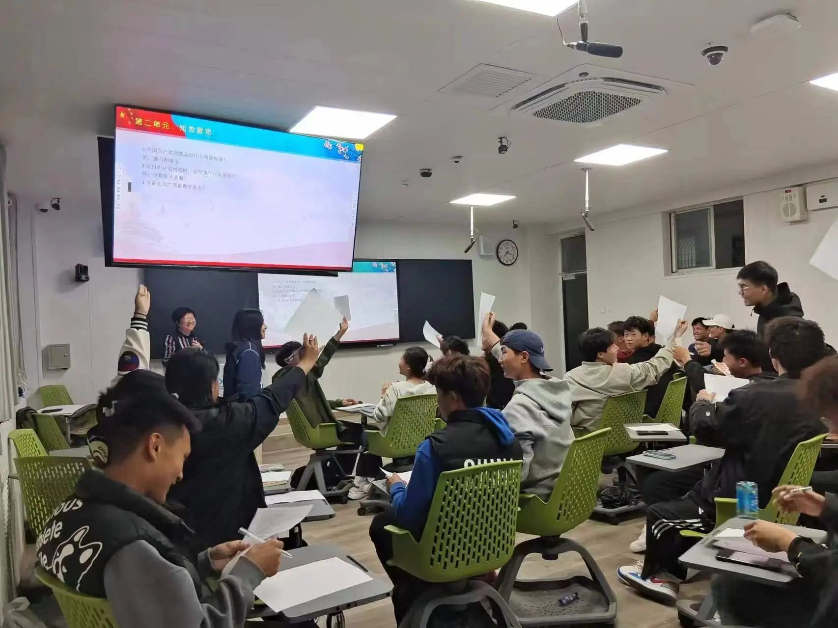 四个单元之间层层递进,逐步引导,单元的各个互动式团体活动紧紧贴合班会爱党爱国主题,形式多样,既有英雄人物猜谜、知识抢答又有红歌合唱、集体手绘,员工参与度高,反响热烈。
